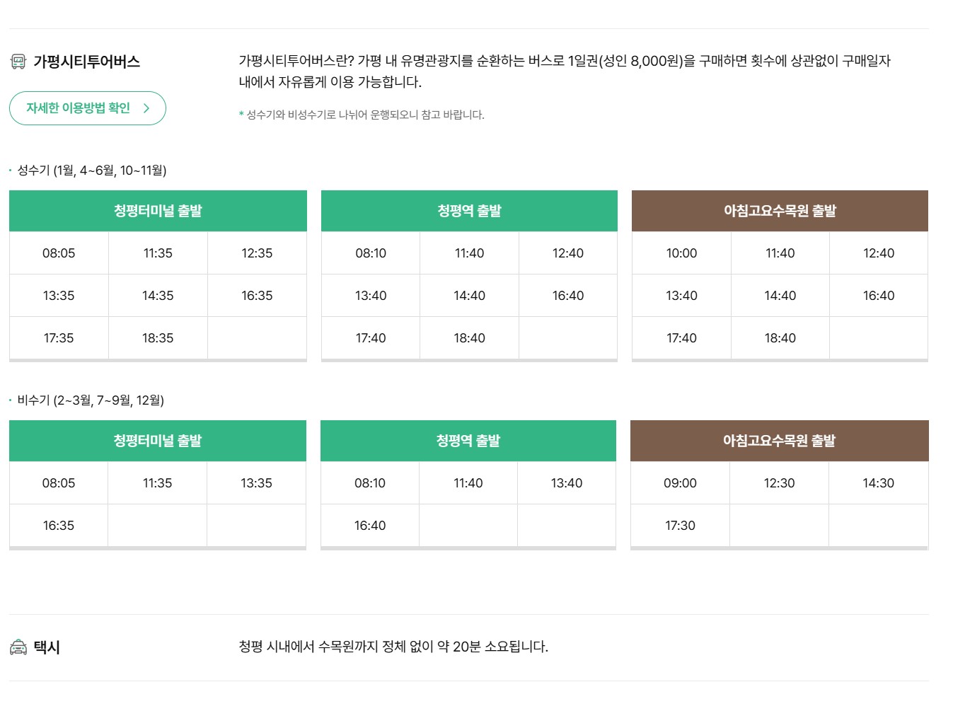 가평 내 유명관광지를 순환하는 가평 시티 투어 버스를 이용하실분들은 아래 요금을 확인하시고 시간표를 숙지하시기 바랍니다