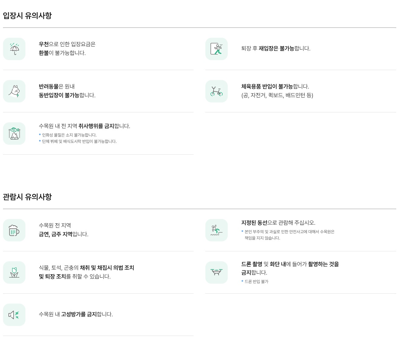 입장시 유의사항으로는 우천으로 인한 입장요금 환불은 불가능하니 이점 참고바랍니다.